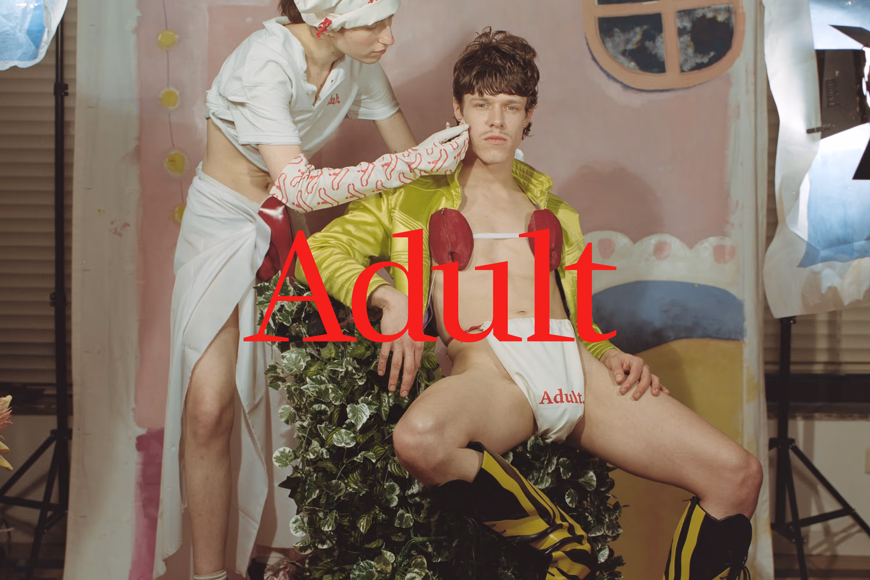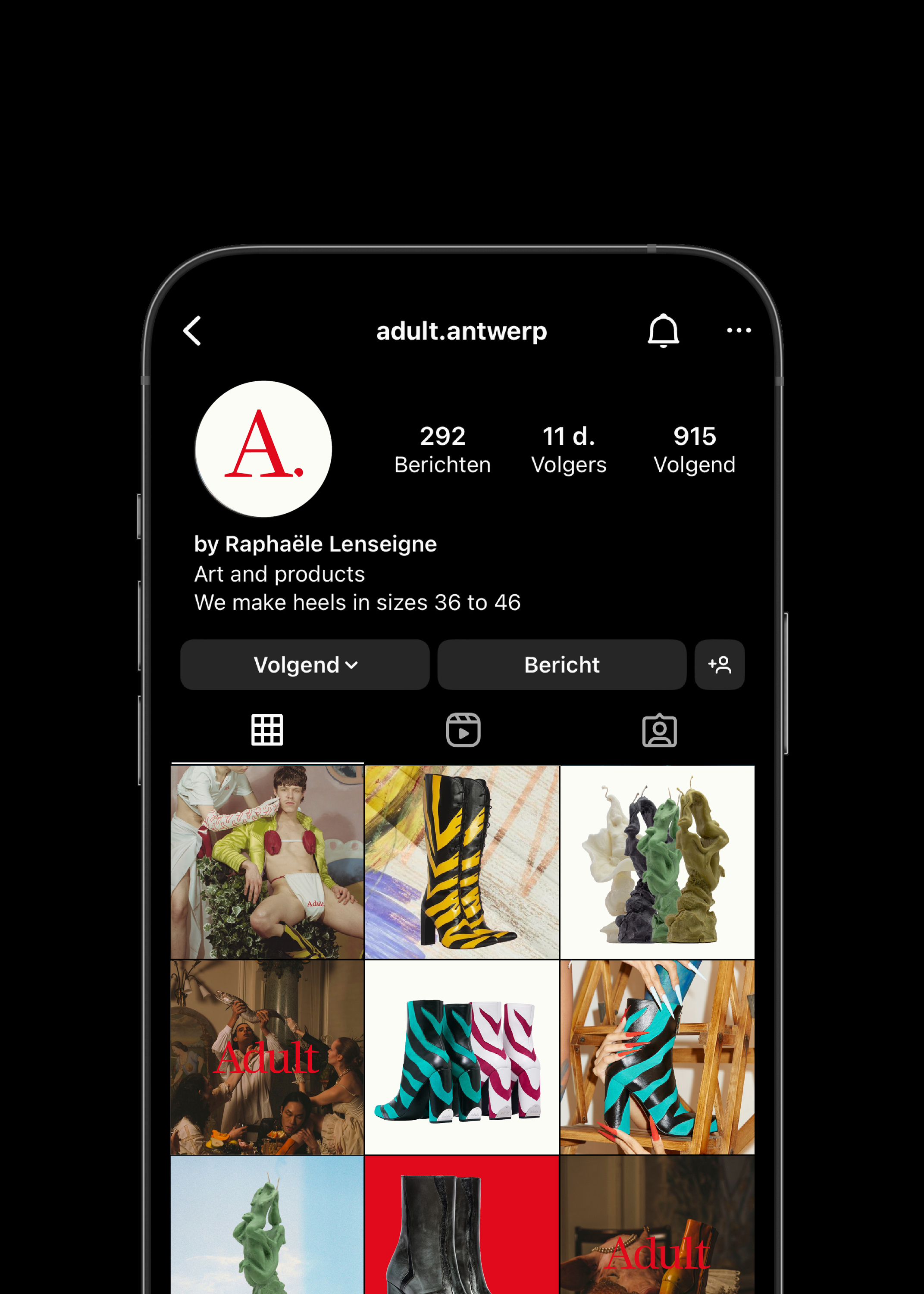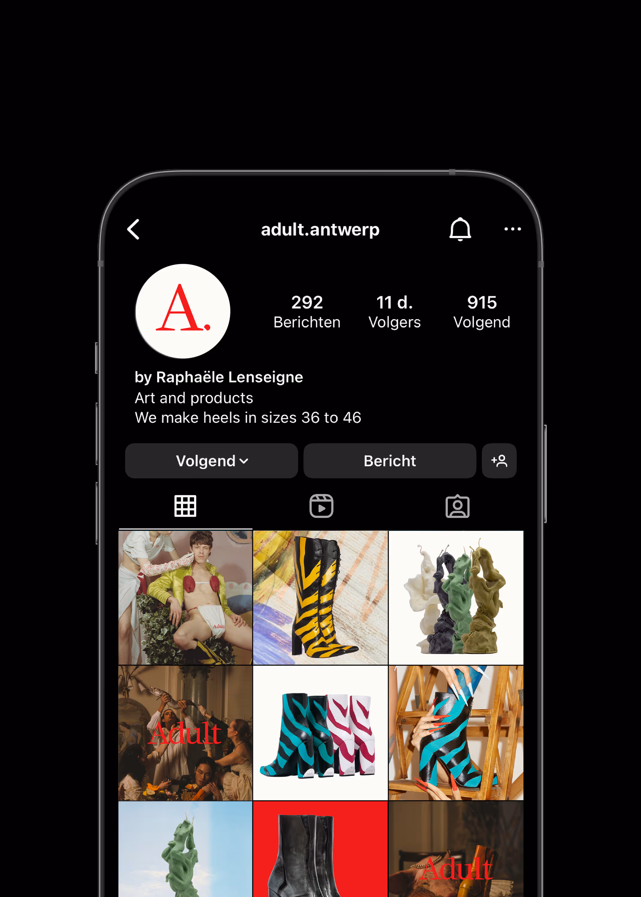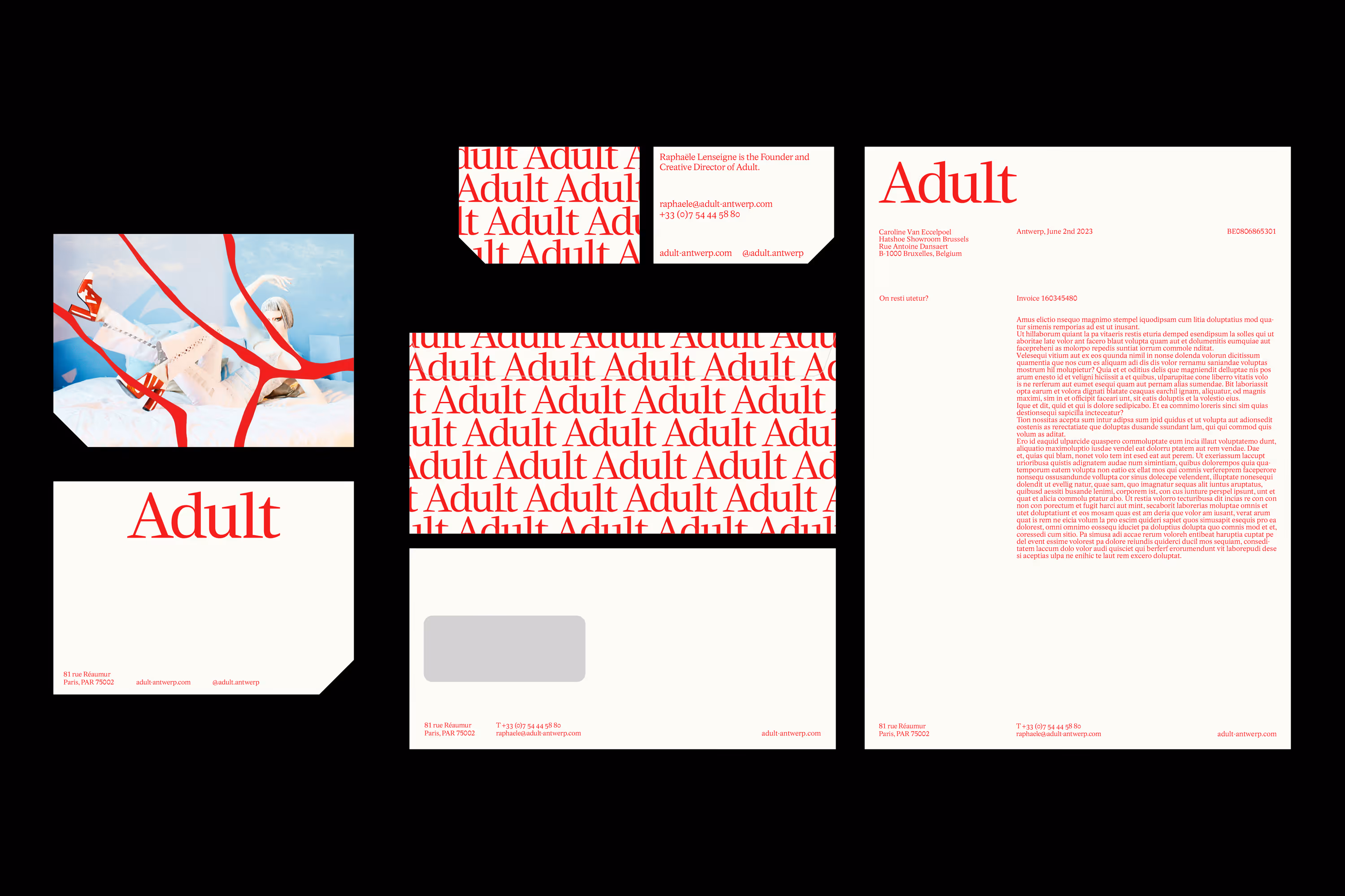 The brand originated from Raphaële Lenseigne’s ambition to create fashion pieces that encourage wearers to explore and redefine their identity. With a spirit of playful disruption, Adult is defined by flamboyant collections of high heels offered in a size range spanning EU 36 to 46, positioning the brand as a tool for emancipation that challenges conventions around gender and self-expression. The bespoke wordmark balances elegance with strong character: its elongated slab serifs subtly reference the silhouettes of Adult’s footwear and incorporate a distinctive cut inspired by the brand’s signature heel detail. The wordmark can be distilled into a simplified icon (an “A” with a detached dot) which retains the characteristic typographic cut, with the dot echoing the footprint shape of Adult’s signature chopped heel. This visual motif recurs throughout the identity system, most notably through a consistent 45-degree cut applied across imagery and layouts for social media, digital platforms, and printed materials. *Made with and for Vrints-Kolsteren.