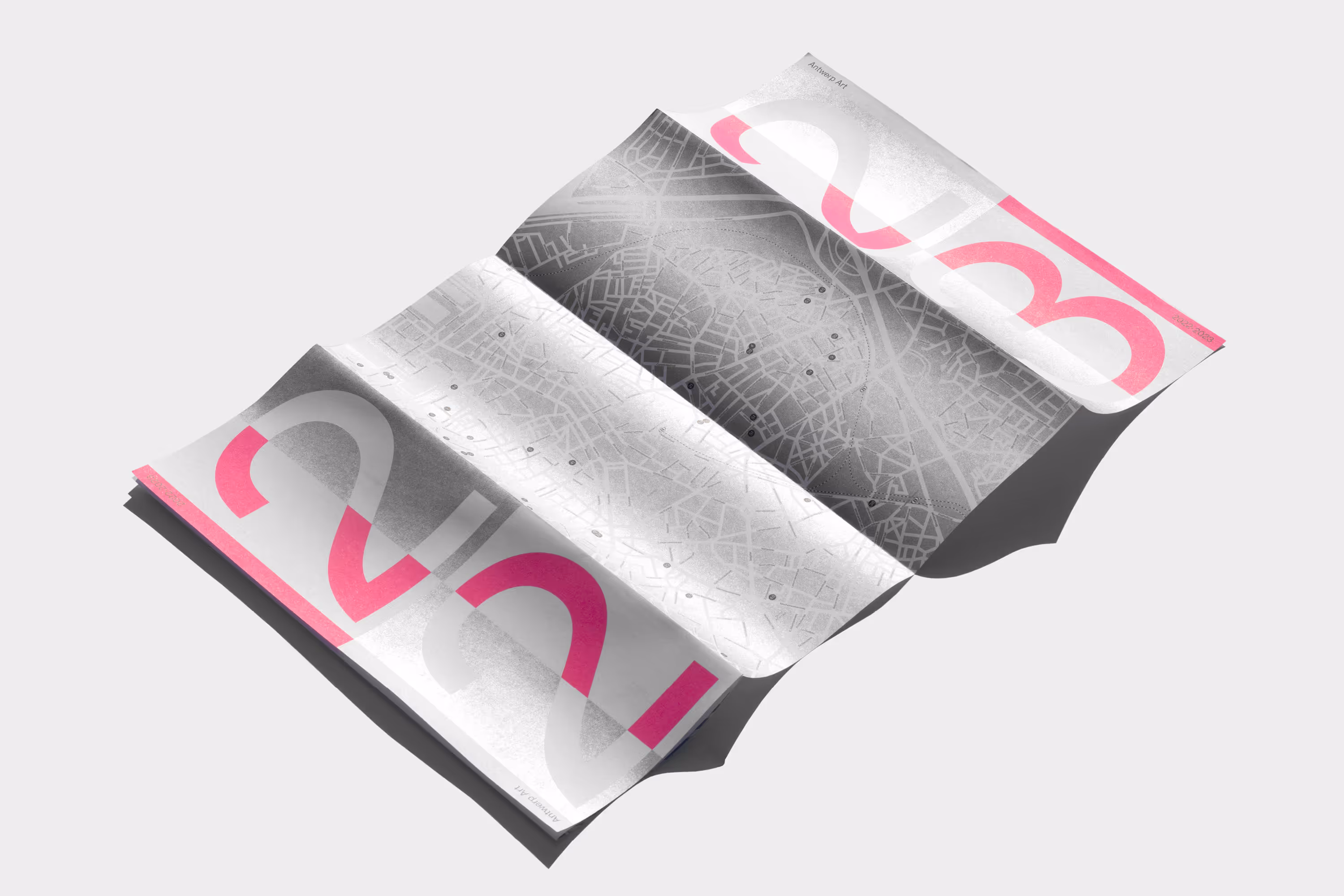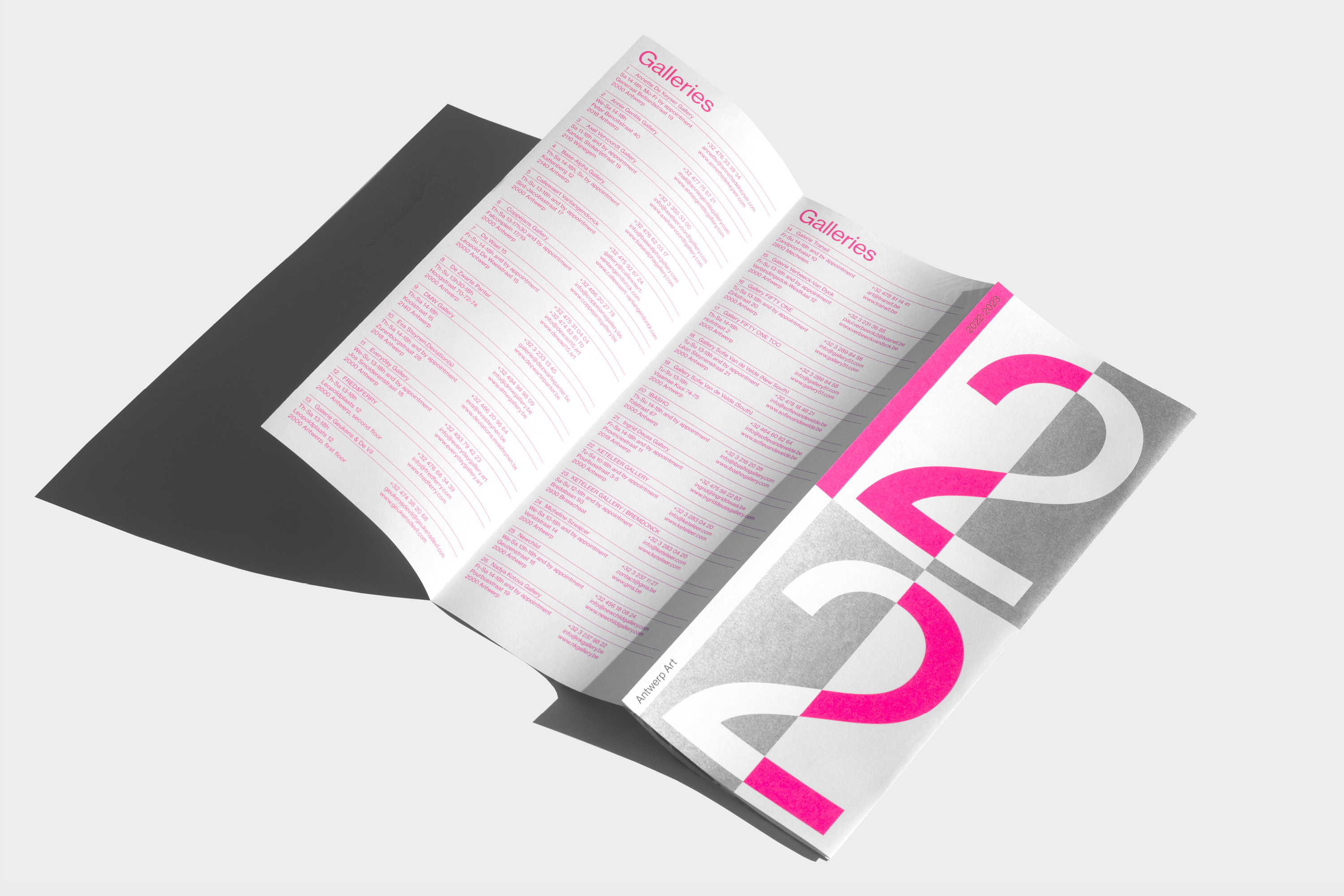 Antwerp Art is a non-profit organization that connects the most relevant actors in the contemporary art scene of Antwerp, from established galleries and museums to upcoming initiatives. Every year they organize Antwerp Art Weekend, a yearly event that combines exciting programmes, talks, performances, book presentations and parties, connecting the most relevant actors in the Antwerp contemporary art scene. For the 2022-23 index, a play on numbers is used to create a cover that can be read in multiple ways, both folded open and closed. *Made with and for Vrints-Kolsteren